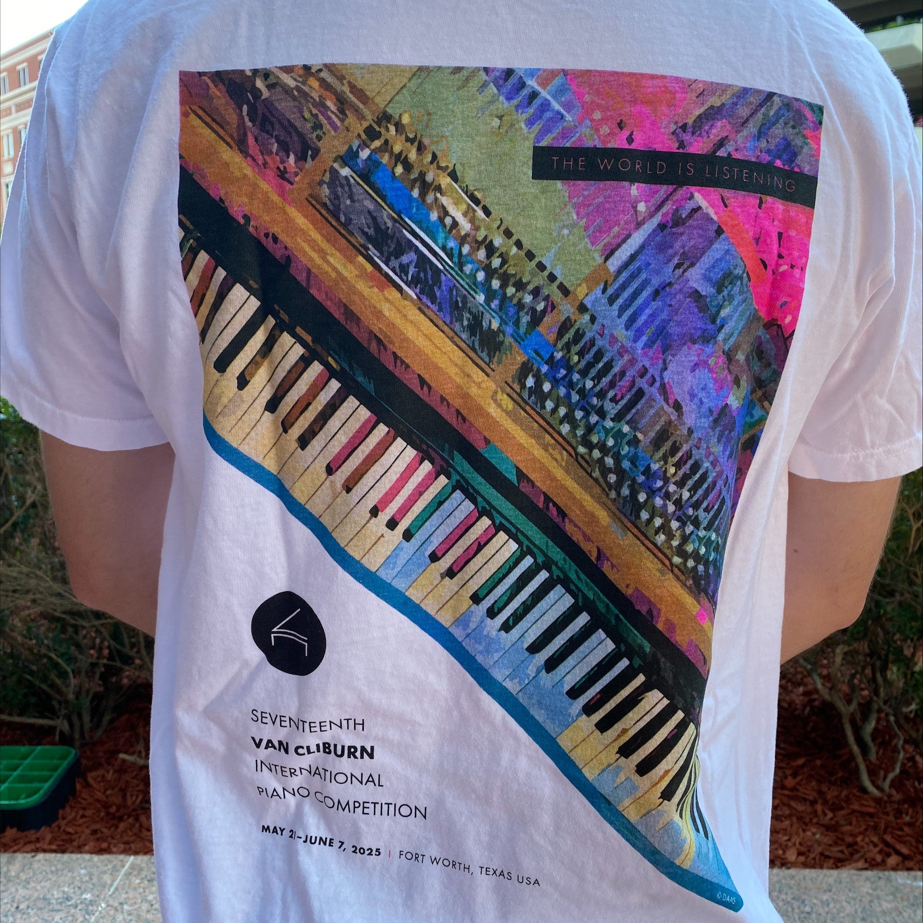 Commemorate the Seventeenth Van Cliburn International Piano Competition with the official 2025 White Cliburn T-Shirt. This comfortable, 100% cotton shirt from Comfort Colors features the iconic VC logo in pink on the front and the full competition artwork by DAAS on the back—a perfect way to remember this landmark event.